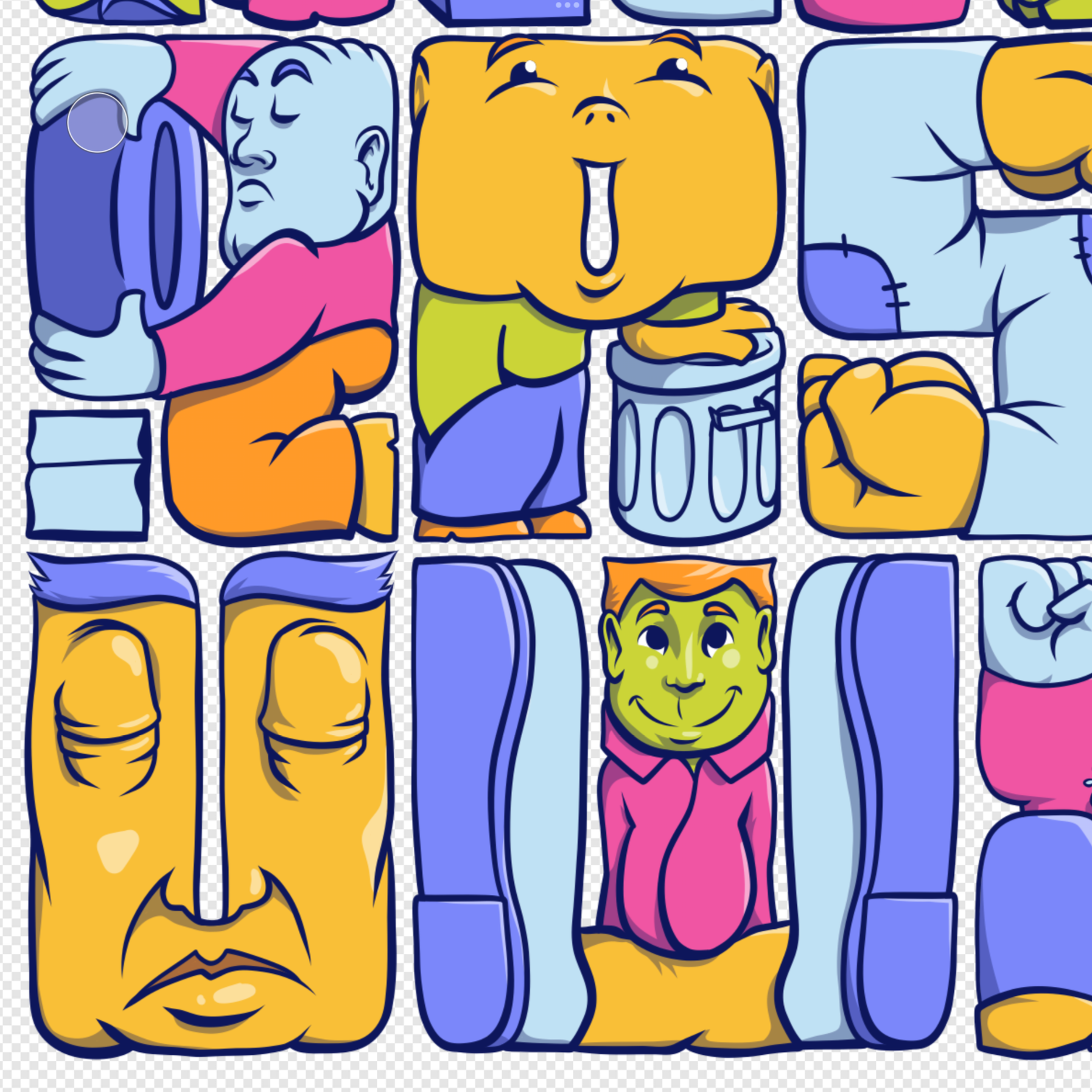 I approached the series like world-building, letting shapes, gestures, and color interactions guide each design. Every character hints at a narrative, inviting the viewer to pause and discover hidden expressions and connections between them.